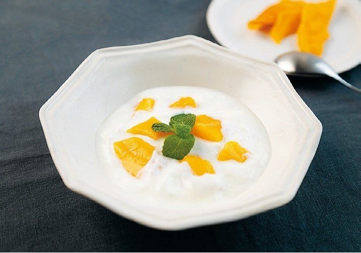 刻んだドライマンゴーをヨーグルトに一晩つけるとプルプルに!はちみつを加えれば三大美腸食材がまとめてとれます。