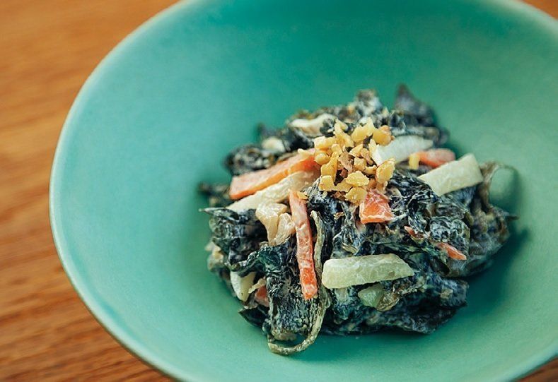 水溶性食物繊維たっぷりの乾燥わかめをヨーグルトに1時間ほどつけてもどし、不溶性食物繊維が多い根菜類を混ぜたサラダ。一品で手軽に美腸食材をたっぷりとれます。
