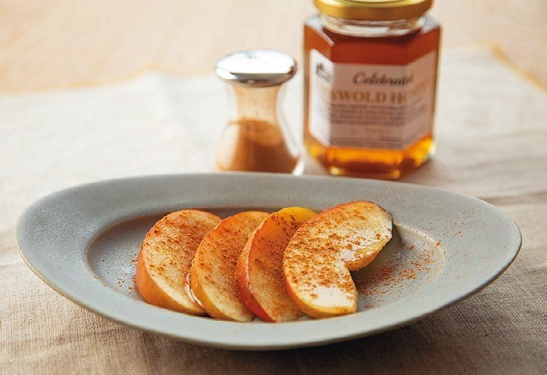 りんごの薄切りを電子レンジで1分加熱し、シナモンとはちみつをトッピング。朝食やおやつにいかが?