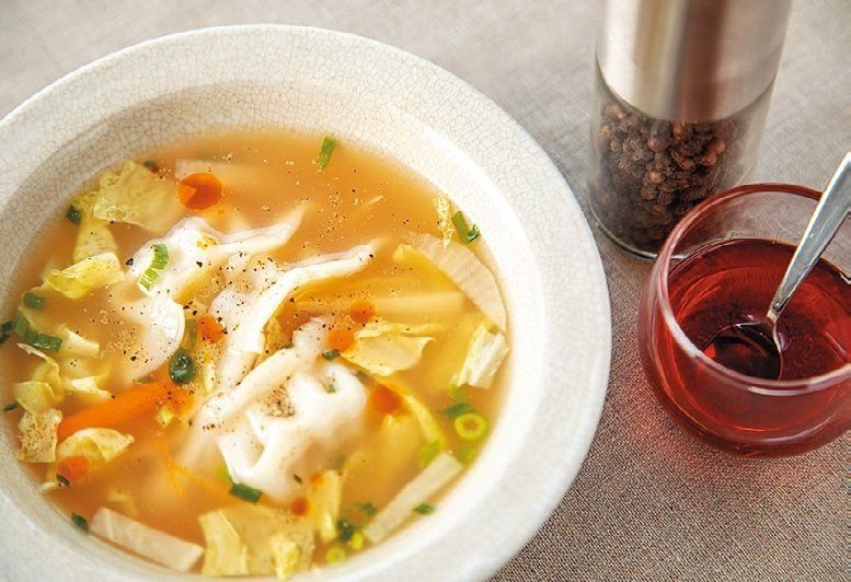 スープにラー油と黒こしょうをふりかけることで発汗促進。黒こしょうはひきたてのほうが温め効果が高まります。