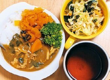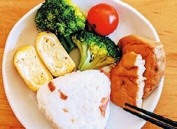 主食とおかずをワンプレートに盛りつけ、昼食や夕食では汁ものをプラスするのが定番。3食とも炭水化物を欠かさず、便秘対策のために切り干し大根や麦ご飯(白米に混ぜて炊く)を食べるようにしている。