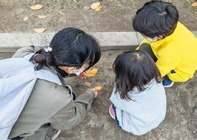 子どもといっしょに砂場で遊んだり、木の実やきれいな落ち葉を探しながら、土の近くに行くことを意識してみました。