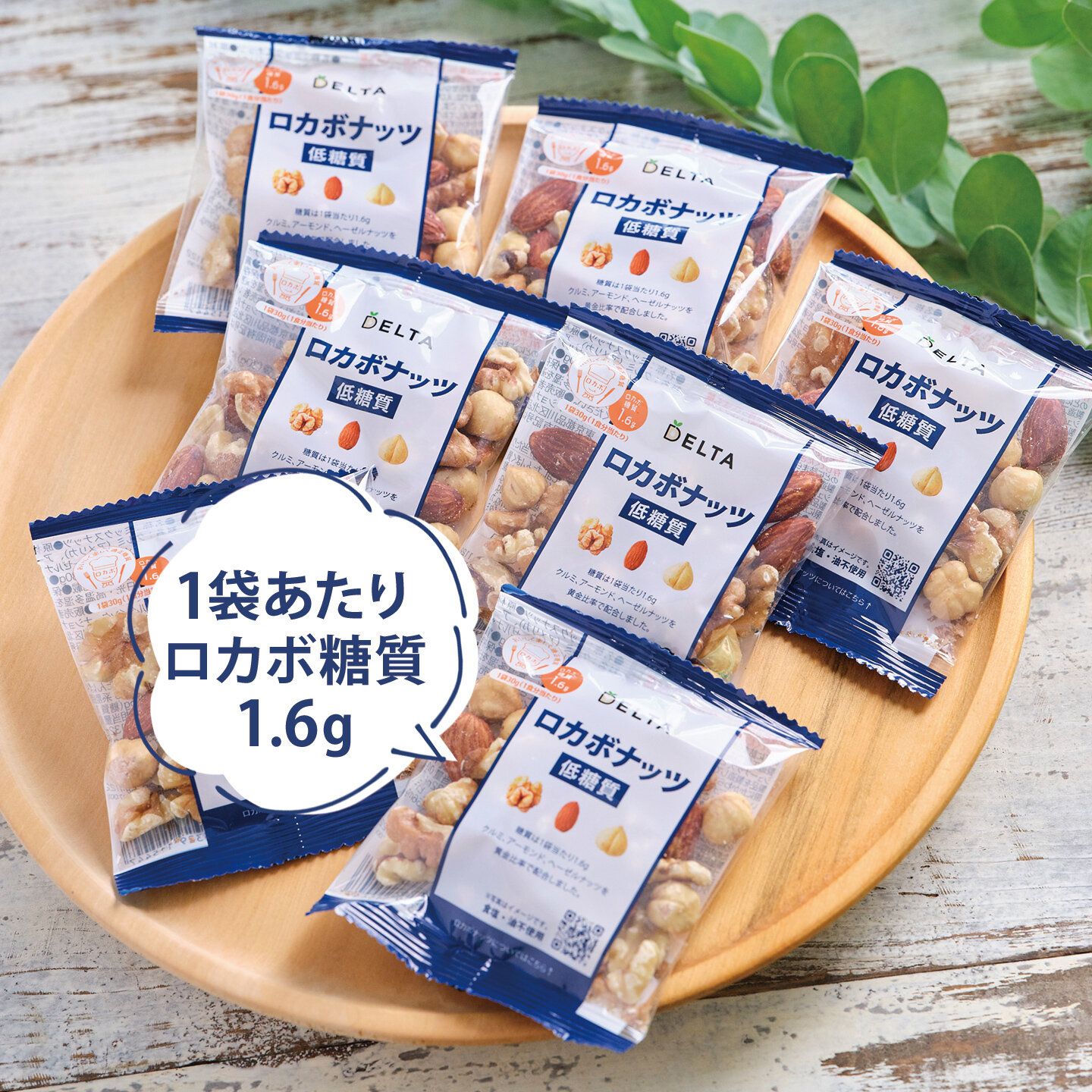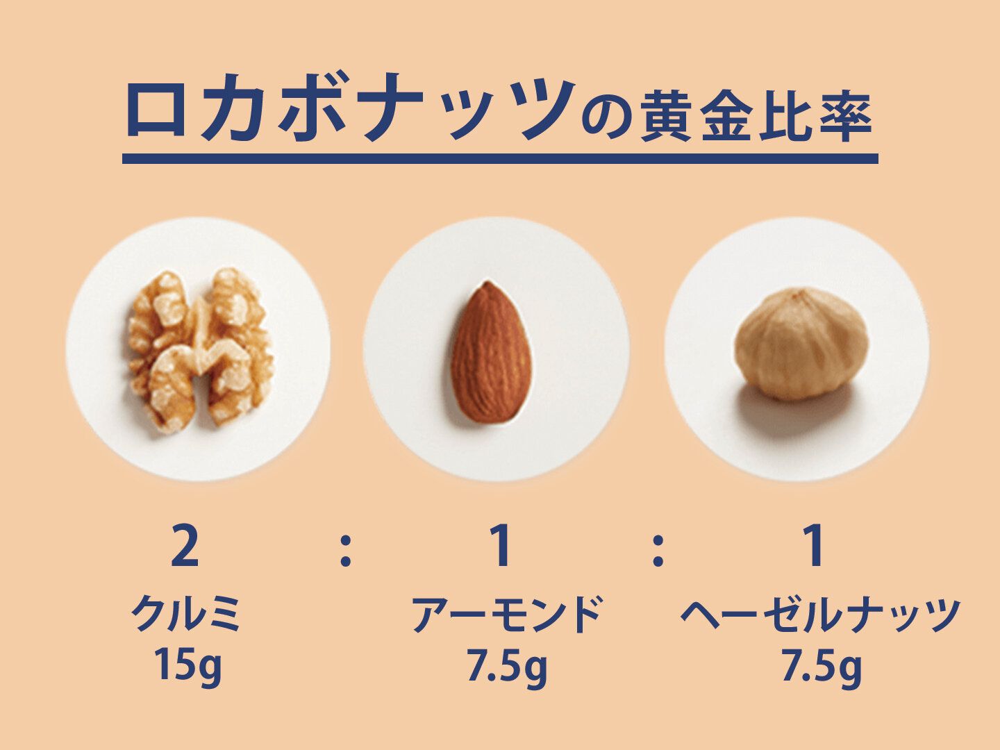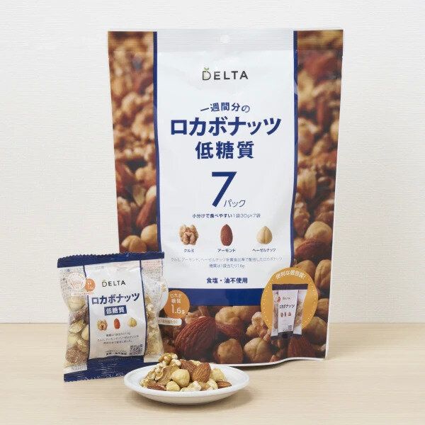 1袋30gの中身はすべて、くるみ15g、アーモンド7.5g、ヘーゼルナッツ7.5gと2:1:1となっています。これはヨーロッパで行われた研究を参考にした栄養バランスを考えたデルタ独自の黄金比率で、食物繊維、オメガ3(n-3系脂肪酸)、鉄、亜鉛、ビタミンEをたっぷり含みます。