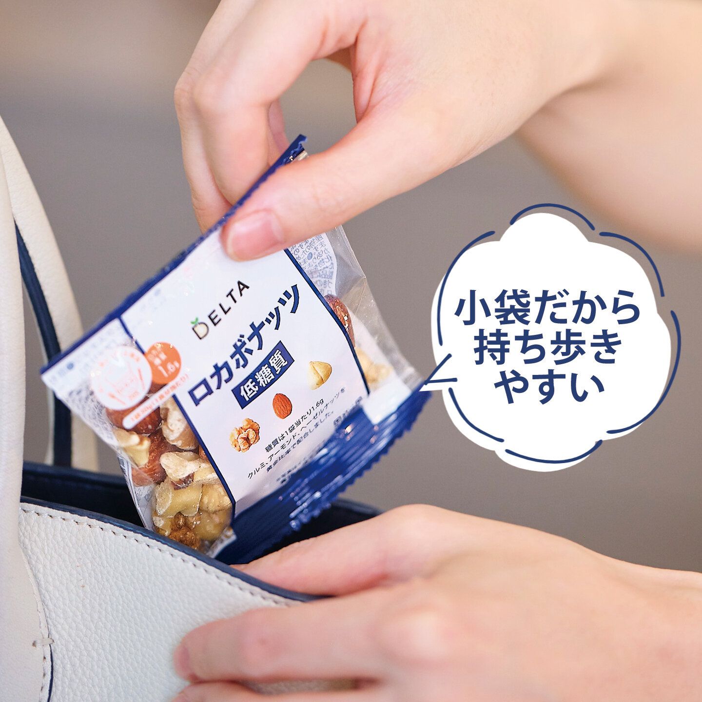 - POINT3:1日1袋の食べ切り個包装 で、持ち歩きにも便利
