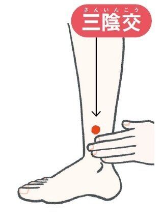 内くるぶしから指4本分上。下半身の冷えや生理痛など女性特有の悩みに効果があります。ツボ部分から5cm離して、ドライヤーの温風をあてて温めたり、寝るときにレッグウォーマーを着用するのがおすすめ。