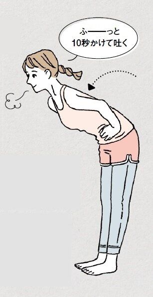 - 2 息を吐きながら、わき腹をもみつつ、上半身を倒す