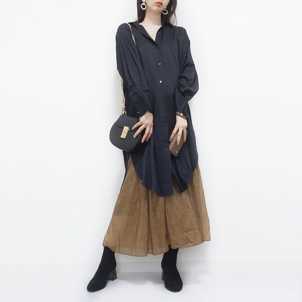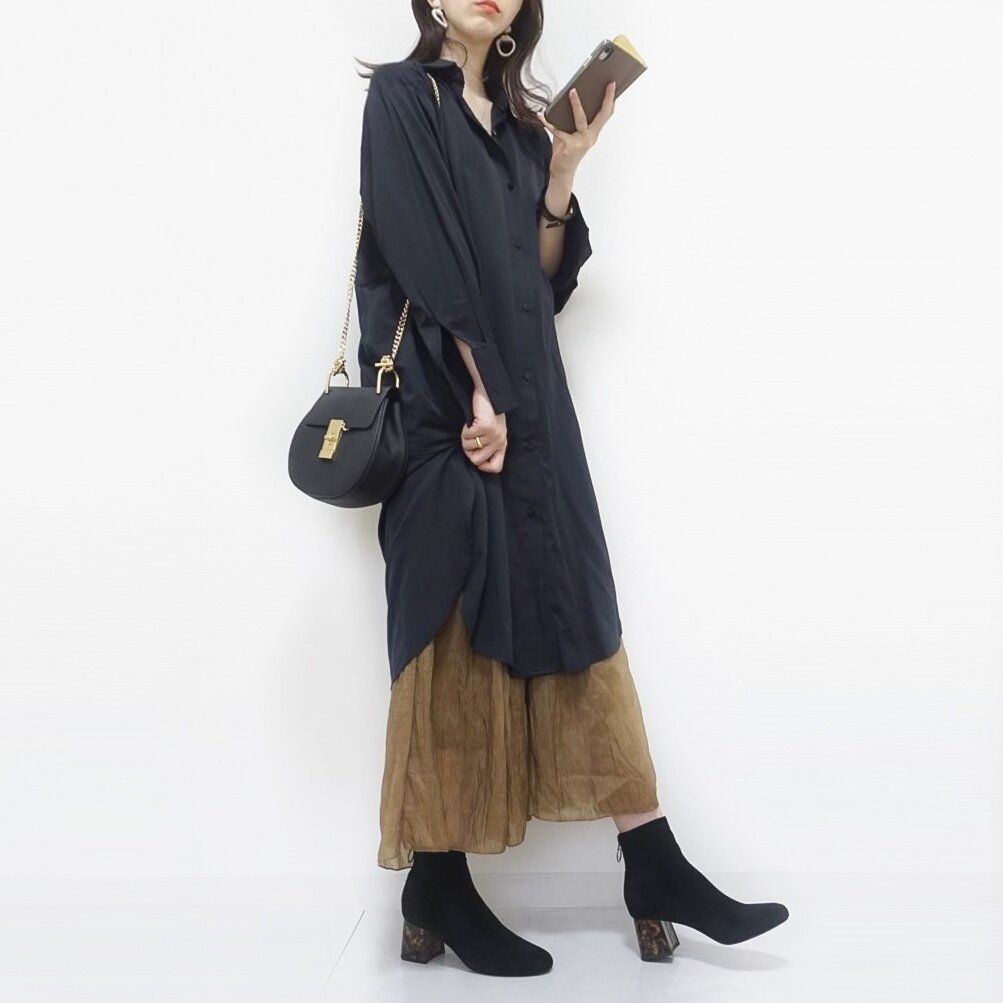 こちらのコーデはロングシャツワンピースとguスカートを合わせました。
