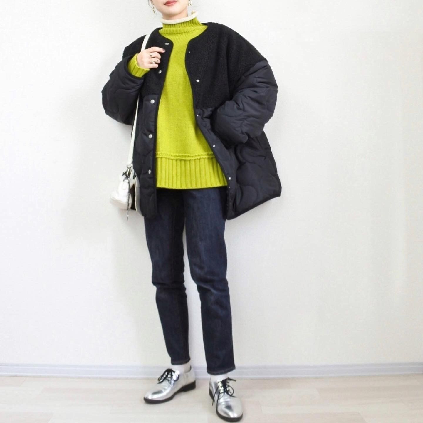 キルティングコート×デニムの定番シンプルコーデですが、インナーをカラーニットにするだけでお洒落に大変身!