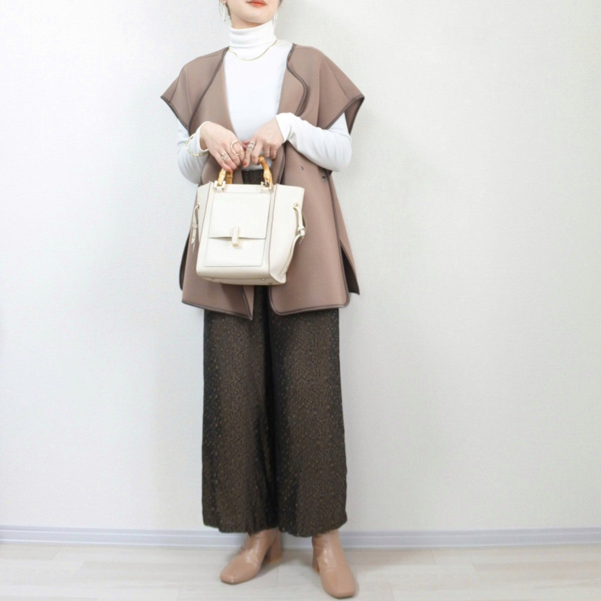今年らしいゆるっとしたオーバーサイズなデザインのベストのインナーとして合わせると旬なコーディネートが完成。