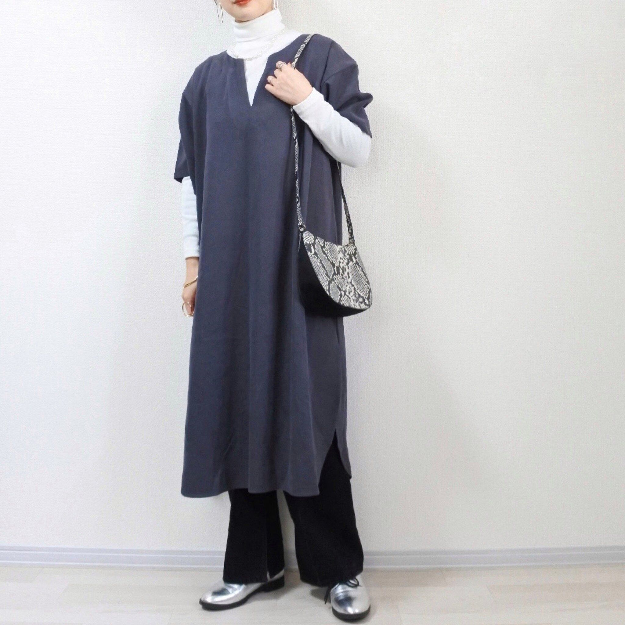 インナーを迷いがちですが、そんな時にタートルネックTシャツを合わせるとこなれた印象に仕上がります。