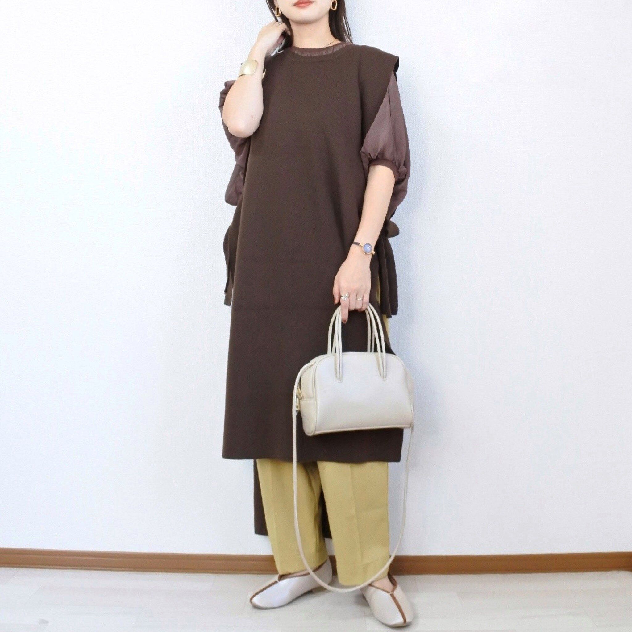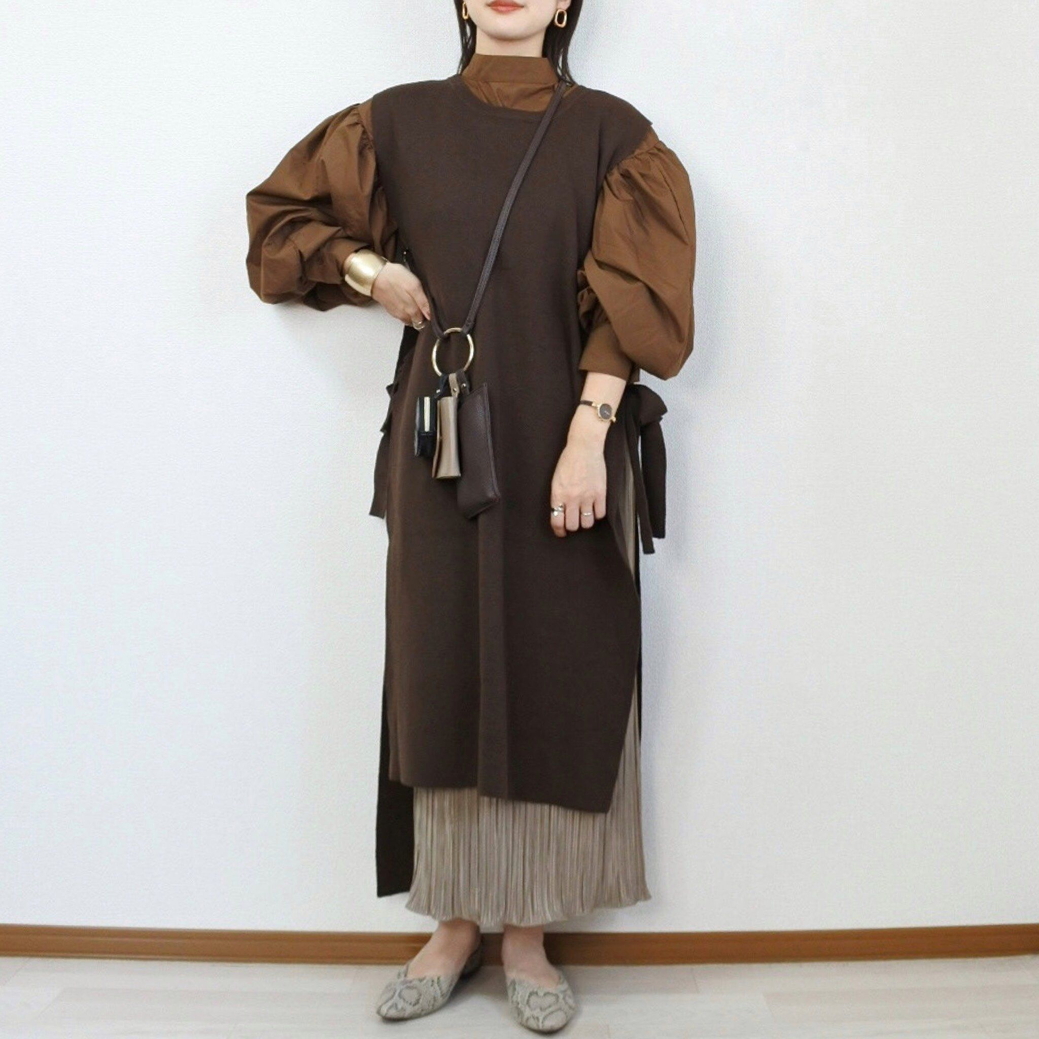 ニットベストと同系色のブラウスとボトムスを合わせることで