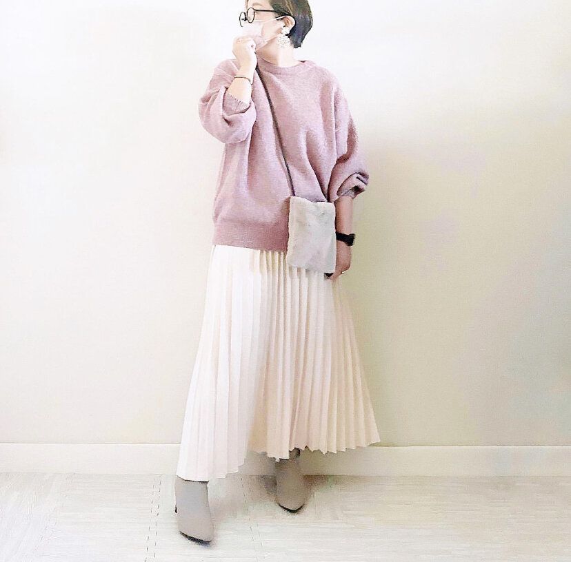 トップスもボトムスもルーズなものを組み合わせるコーディネートも人気ですが、トップスはジャストサイズを選ぶことによりメリハリが出て着やせ効果が期待できます。ふわりと揺れるシルエットがおしゃれなプリーツスカートは、気になるお尻回りや下半身をカバーしてくれるのでこちらも着やせアイテムとして優秀なアイテムです。
