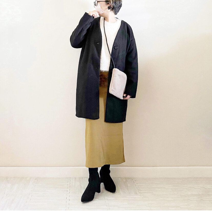 タイトスカートはおなか回りやお尻回りが気になるという人もアウターがカバーしてくれるのでマネしやすいですね。トップスにシャギー素材を取り入れてトレンド感もプラスしているのはさすがです!