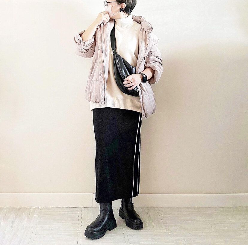中綿アウターに合わせるボトムスはすっきりとタイトなものを選べばメリハリが出て丸い印象を回避できますよ。しまむら「ニットフリースラインナローSK」(1,089円)のように縦ラインのポイントがあるアイテムを使えばより下半身もカバーできます。