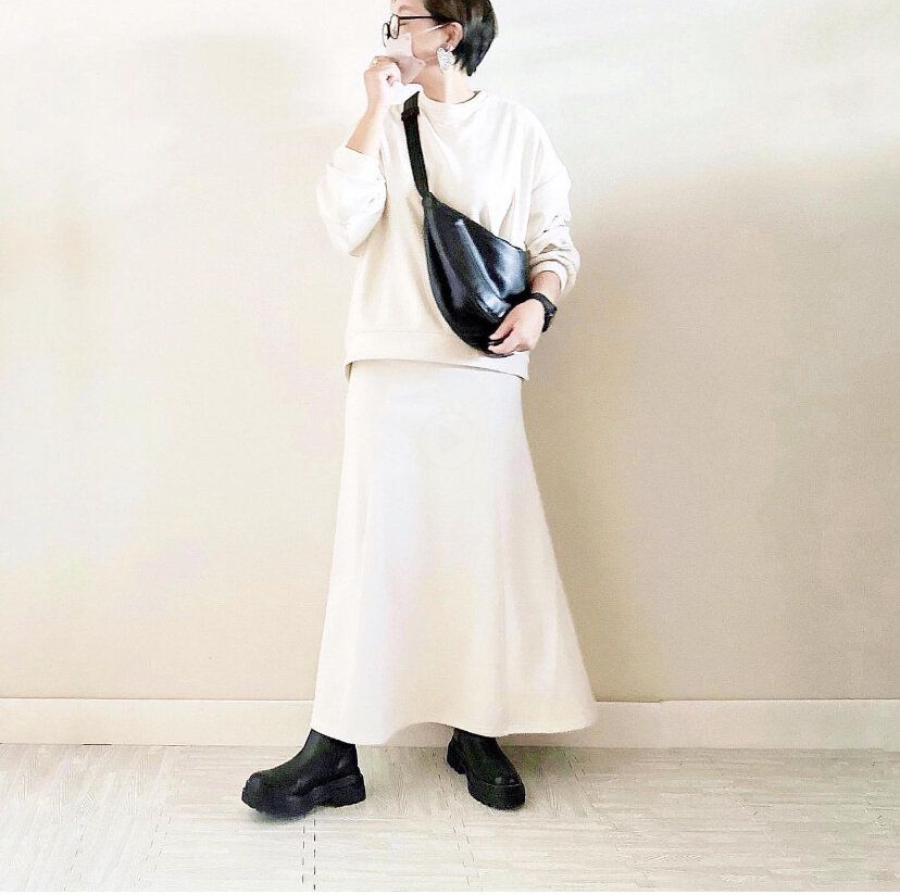 着やせ効果があるデザインのマーメードスカートのホワイトのセットアップに黒のショルダーバッグを高めの位置で合わせることでさらに着やせ効果をプラス。バッグのカラーでメリハリを出すだけでなく目線が上に行き、すらっとした印象を演出してくれます。