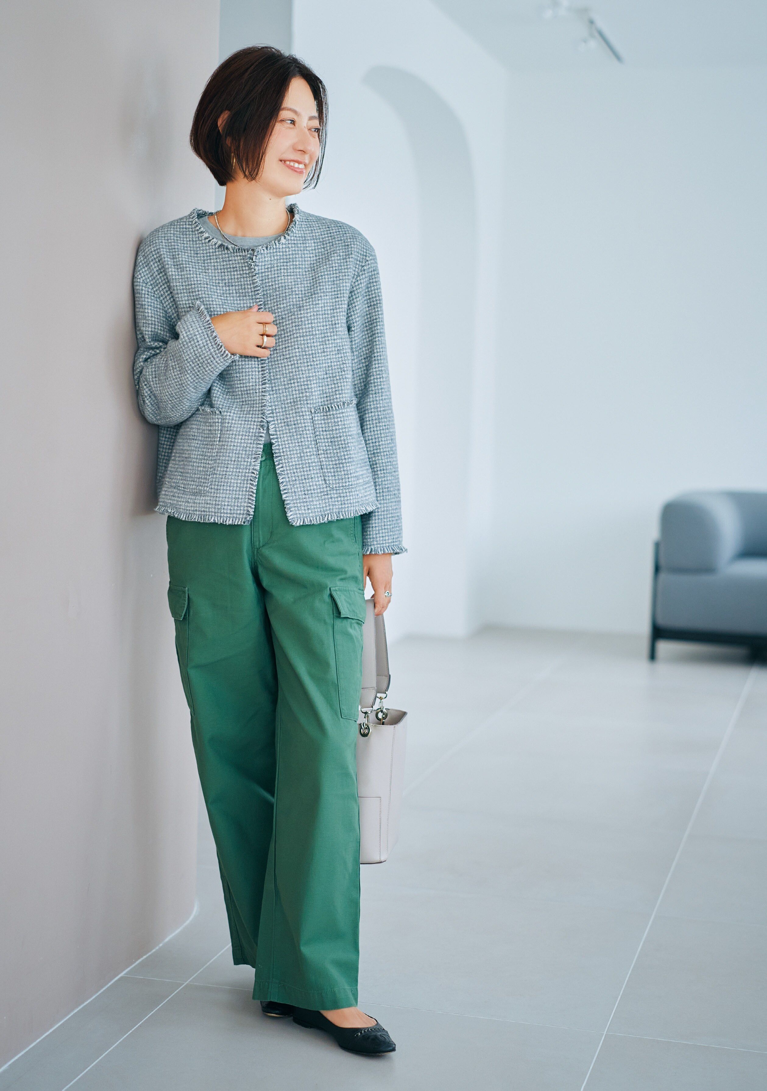 「柔らかいグレーで、フォーマルにもカジュアルにも使いやすいデザイン。スカートはもちろんデニムやカーゴパンツにもマッチし、1着あるとかなり重宝します。裏地がついていてしっかりした作りなのも魅力」。