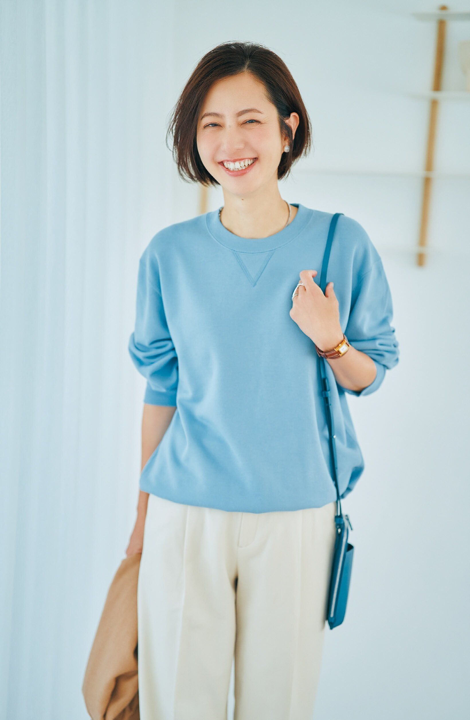 「あえてメンズをオーバーサイズぎみに着るのが旬の着こなし。このスウェットは生地がへたりにくいから、だらしなく見えないのがいい!すごくキレイなスモークブルーは、ボトムの色を選ばず使いやすい」。