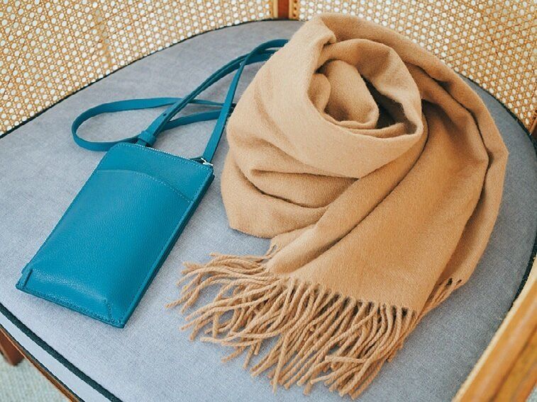 ブルーは白や黒だけでなく、キャメルカラーとも相性がよくエレガントに見えます。バッグやストール、靴など小物の組み合わせで、ぜひ試してみて。