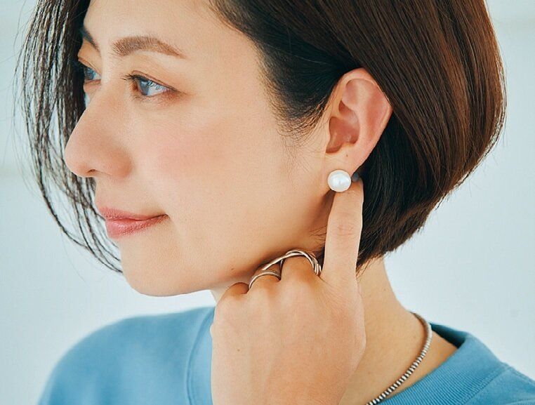 オーバーサイズのメンズ服をコーデに取り入れたカジュアルスタイルに、パールのアクセサリーをプラスして、品よく仕上げるのが気分です。