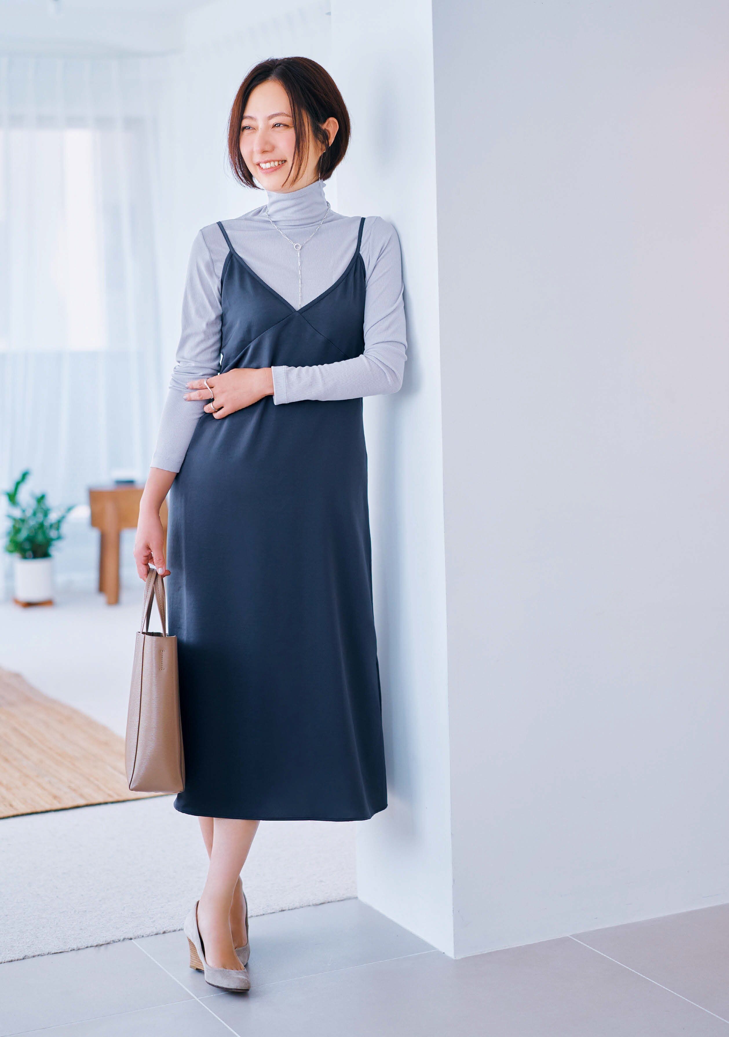 つや感のあるポリエステル素材。胸下部分の切り替えで脚が長く見える。「キャミソールワンピース」(グレー、ブラック、ブラウン・全3色)/ユニクロ
