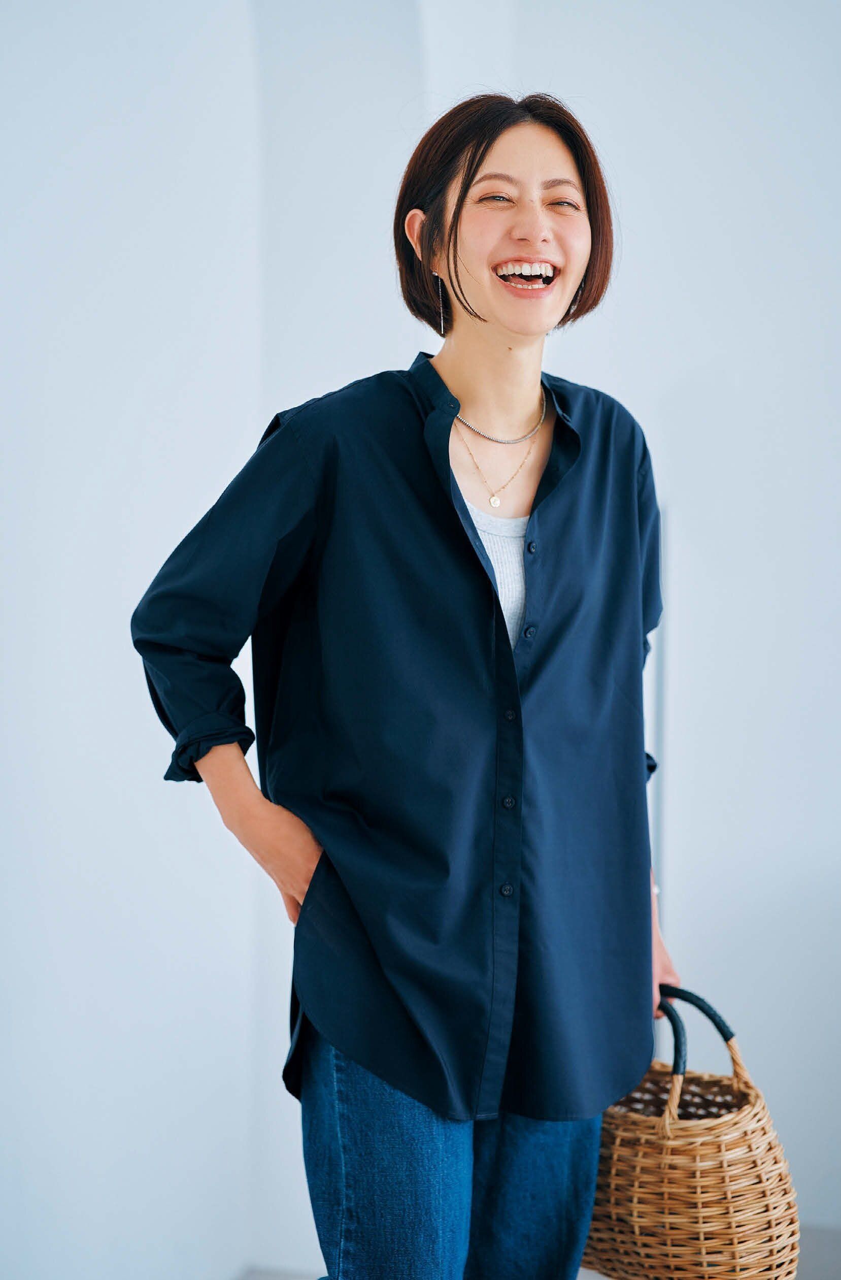 「薄くて軽く、秋にさらっと羽織れる便利なチュニック。ウエストアウトしても使いやすい丈感や、くるみボタン、丸みのある裾など凝ったディテールがおしゃれです」。