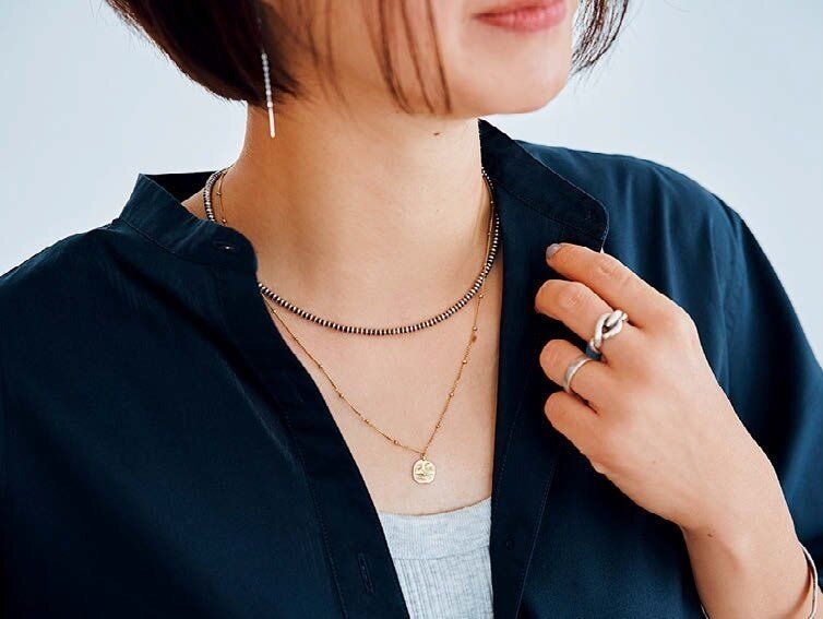 短くて太いシルバーと、長く繊細なデザインのゴールドを重ねづけすると個性が出せます。手持ちのネックレスでいろいろな組み合わせを試してみて。