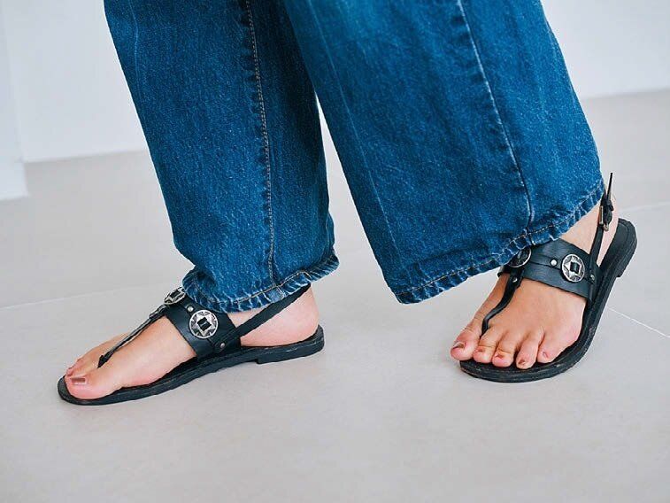 40代に似合う旬のデニムは、脚のラインを拾わない太めのセミフレア。濃いめのブルーは、ネイビーのトップスともよく合います。