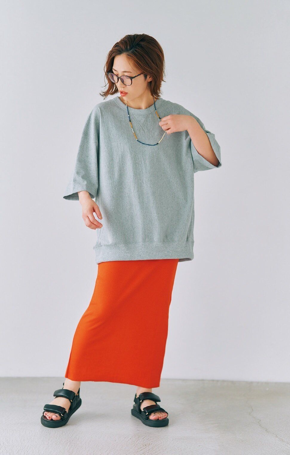 スカート/FREAK’S STORE、「パフィーダブルベルトサンダル」¥2,490/GU、ネックレス/LOWRYS FARM