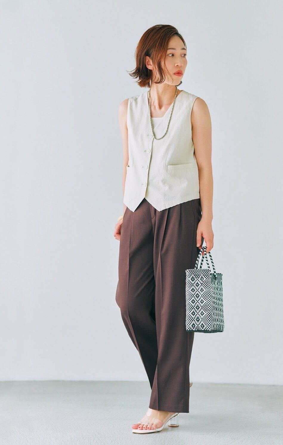 「リネンブレンドコンパクトベスト」¥2,990、「リブスクエアネックニットタンクトップ」¥1,490/GU、メルカドバッグ/Bshop、クリアサンダル/ORiental TRaffi c、ネックレス/kutir