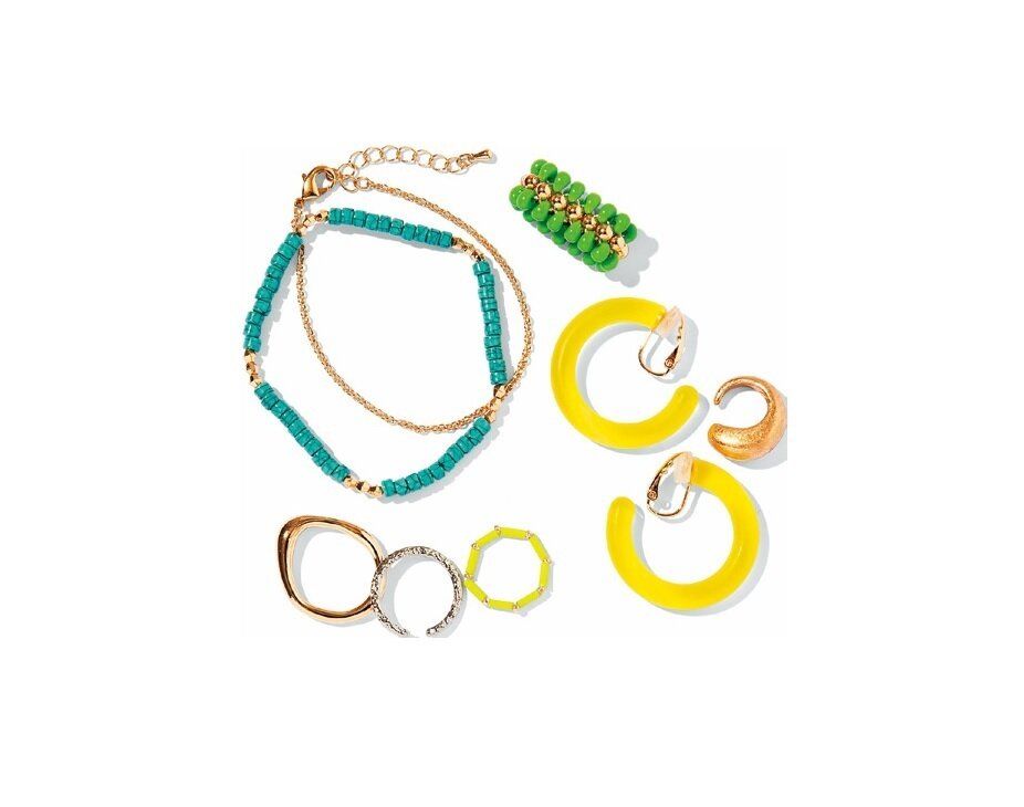 シンプルな服のアクセントにぴったり。右下の3点「クリアフープイヤリング&イヤーカフセット」、右上の緑色と左下の3点「カラービーズ&メタルリングセット」、左の2点「カラービーズブレスレット」すべて¥590/GU