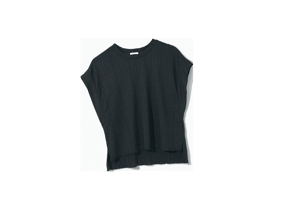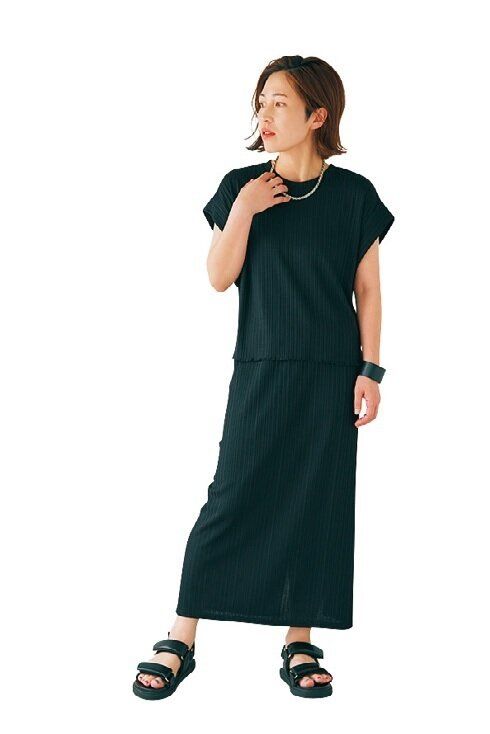 「サラサラのリブ素材は、アイロン不要でシワも気にならないうえに、高見え&着やせまで実現!セットで着ればちょっとモードな雰囲気に」。