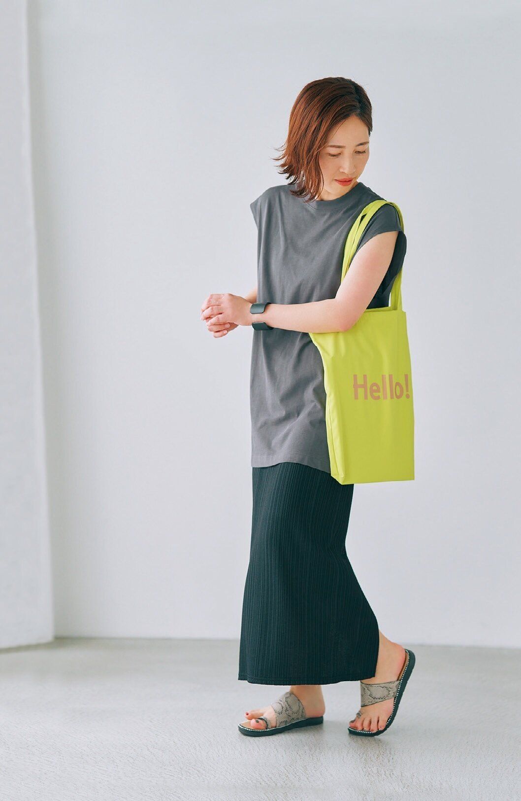 「オーバーサイズノースリーブT」¥1,490/GU(※一部店舗のみ販売)、サンダル/しまむら、「メッセージトートバッグ」¥790/GU