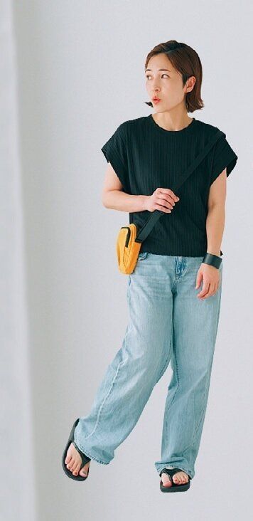 デニムパンツ、「レザータッチバングル」¥590、「ネックポーチ」¥990/GU、サンダル/OOFOS