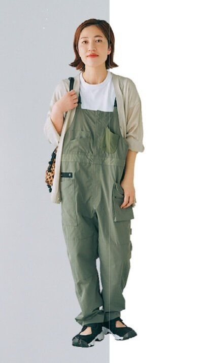 サロペット/ワークマン、Tシャツ/ユニクロ、バッグ/HAYNI.、スニーカー/ナイキ
