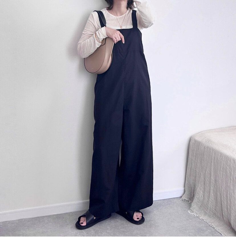 クローゼットにある手持ちのシンプルなTシャツを合わせてもスタイリッシュな印象を与えてくれるのはサロペットの最大の魅力です。ウエスト部分に締め付け感がないので着用時もリラックスできるのもうれしいポイントです。