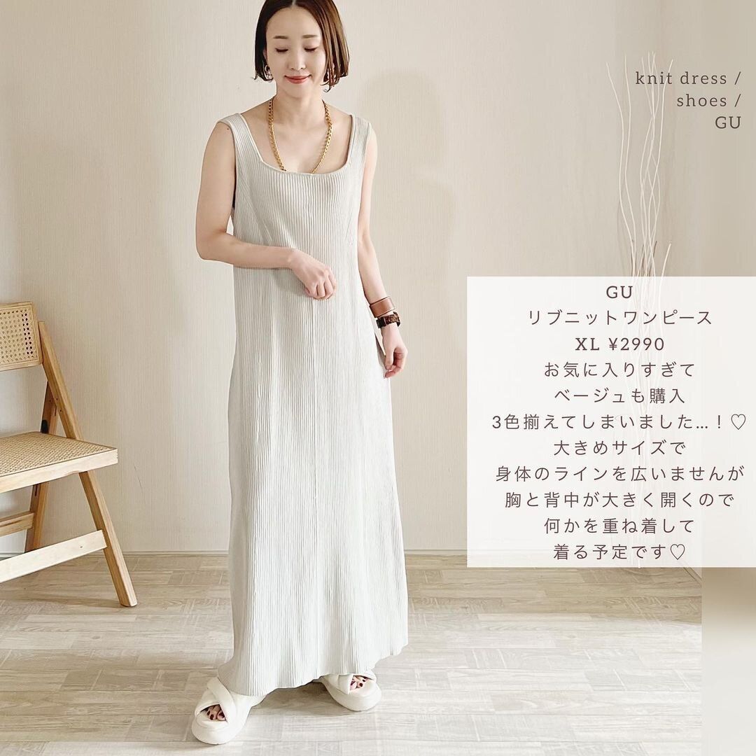 GUの「リブニットワンピース/2,990円」は、さきほど紹介したユニクロのワンピースよりもややルーズなシルエットが特徴的。着れば自然とリラックス感のある雰囲気になるので、肩のこらない着こなしが叶います。スクエアになったネックラインは、合わせるネックレスのデザイン・長さを選びません。華奢なものから大きなコインネックレスまで試してみて。