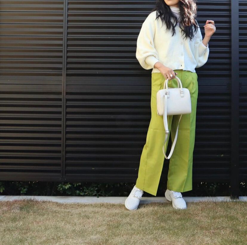 白×グリーンは優しい印象を与えてくれる上に、個性的なカラーでもすんなりなじむ初心者におすすめの組み合わせ。パンツ以外は白で統一することで、カラーアイテムを使ったコーディネートでも派手になりすぎないですし、春らしい華やかな印象もしっかり与えてくれます。肌寒い日でも季節の先取りが出来るお手本コーディネートですね。