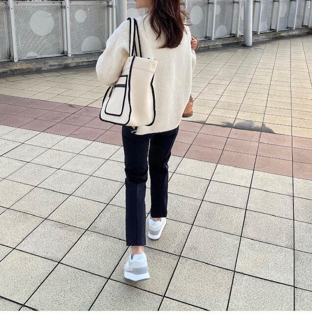 細身のブラックのパンツにスニーカーを合わせたシンプルでカジュアルなスタイルもモノトーンでまとめることでハンサムママコーデが完成します。少しオーバーサイズのニットをチョイスする事で程よいルーズ感を取り入れるのがポイント。