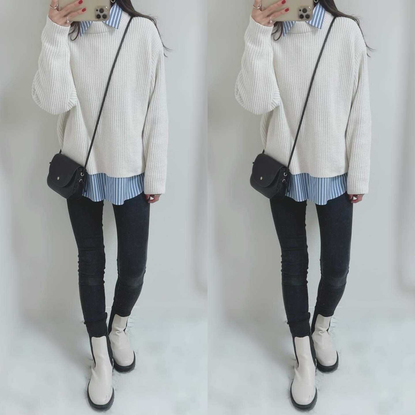 ウォッシャブルソフトニットクルーセーターはオフホワイト・ネイビー・ピンク・ブルーの全4色展開で販売中。Instagramで活躍するファッションインフルエンサー達はオフホワイトとピンクを購入している人が圧倒的に多い印象です。どちらのカラーもコーディネートの印象を明るくしてくれるカラーで、肌寒い日でも春を意識したファッションを楽しむことができちゃいます。トレンドのストライプシャツをのぞかせれば防寒しつつ季節を先取りできますね。