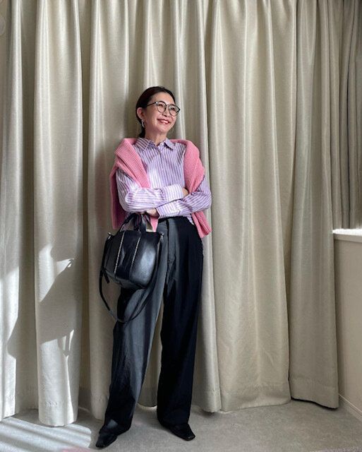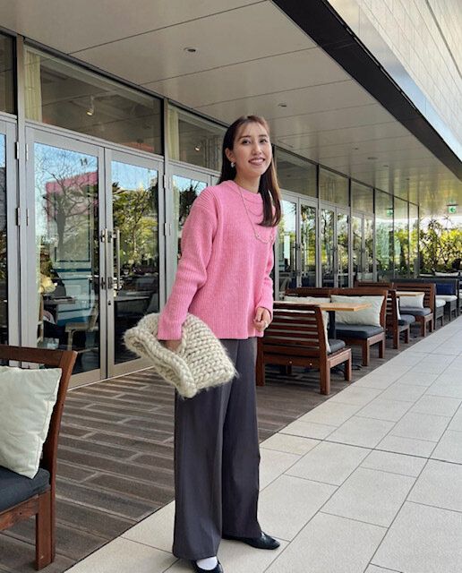 トップスとして着用するだけでなく、ニットを肩にかけてファッションのワンポイントとして使うのもおしゃれ。特にピンクはさし色として大活躍してくれます。シャツ×パンツのシンプルなシンプルなスタイルに肩掛けニットをプラスするだけでワンランク上のスタイリッシュなコーディネートが完成します。