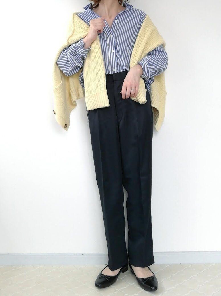 シャツ×パンツスタイルが「なんか物足りない……」と感じたら、カーディガンを肩かけするのがおすすめ!ノーアクセサリーでもぐっとおしゃれ感を演出することができます。