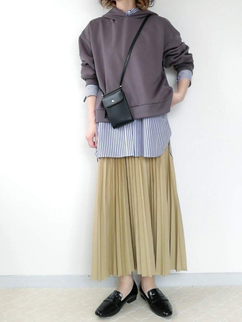 カジュアルなパーカーに、きちんと感あるシャツをレイヤードすることで、大人っぽいレイヤードコーデが完成!