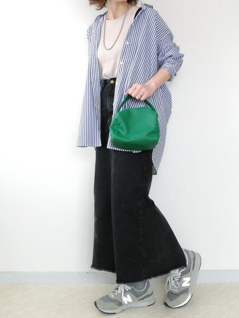 ここ数年は、ビックシルエットのファッションが流行しています。ゆるっとタボッと着るのがおしゃれ。体の気になる部分を隠してくれるのもうれしいですよね。余裕あるサイズのストライプシャツをサラっと切るだけで、おしゃれな雰囲気が出せますよ。