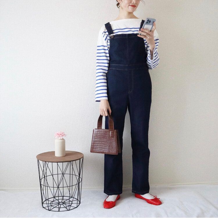 子どもっぽくなりがちなサロペットを大人カジュアルに着こなすなら少し明るい印象のボーダーと合わせるのがマスト。