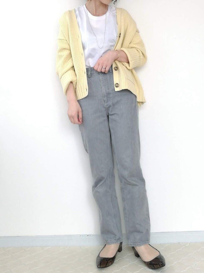 モノトーンでまとめたシンプルな着こなしに、柔らかなたまご色カーディガンで春らしさをプラス。