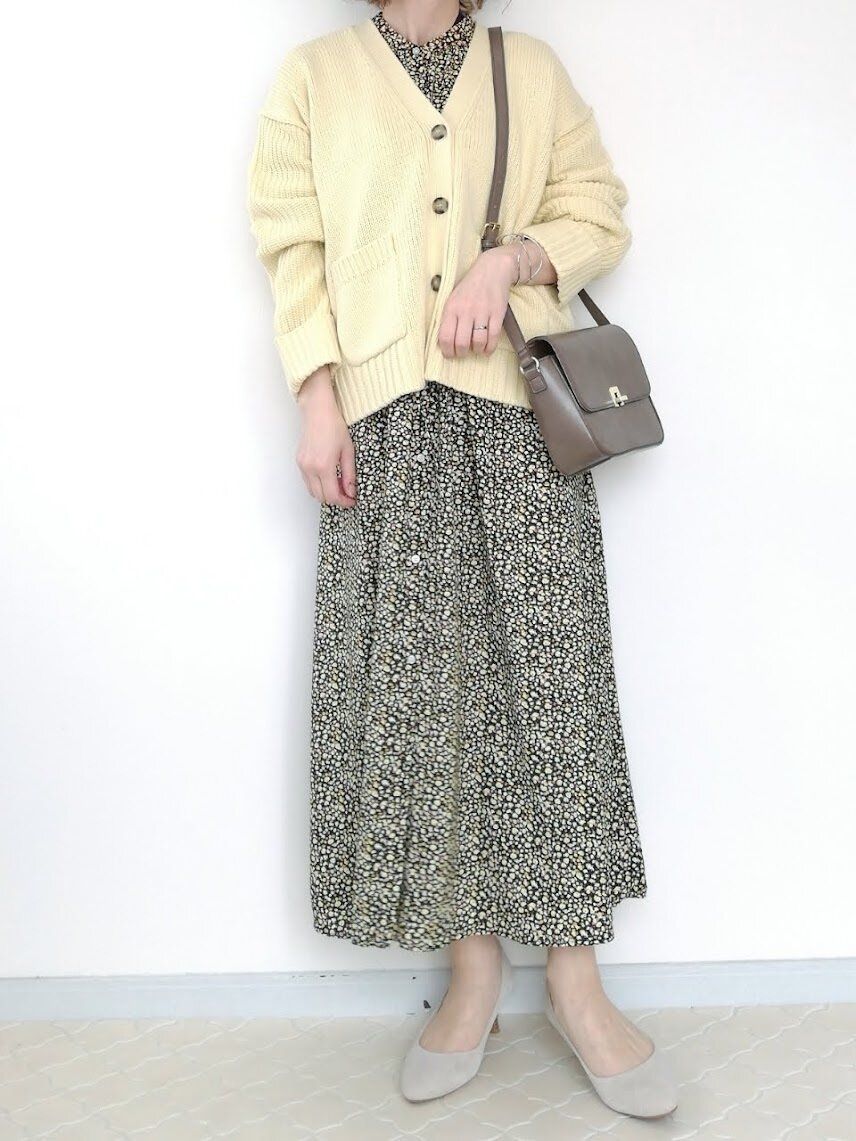 花柄の中から1色拾ってカーディガンと合わせると、統一感ある雰囲気になって◎。