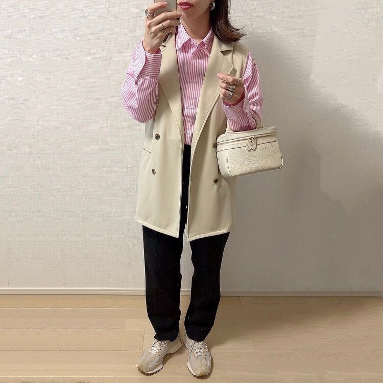 ストライプシャツは春に注目されているジレとも相性抜群。