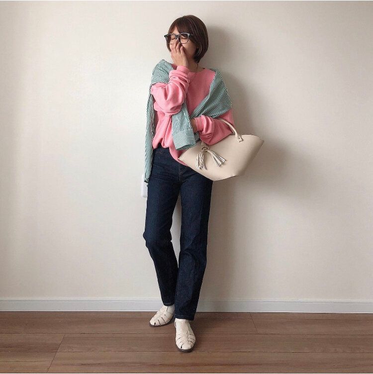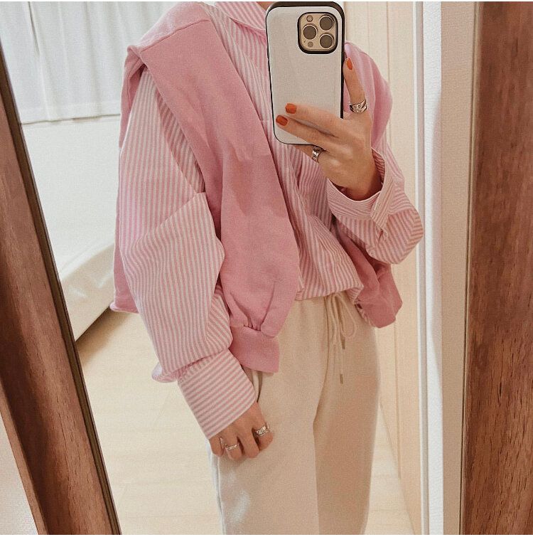 ピンクのストライプシャツにピンクのスウェットとワントーンの組み合わせも、ストライプ柄をチョイスすることでやりすぎ感を払拭してくれて、だれでもチャレンジしやすいワントーンコーディネートが完成します。