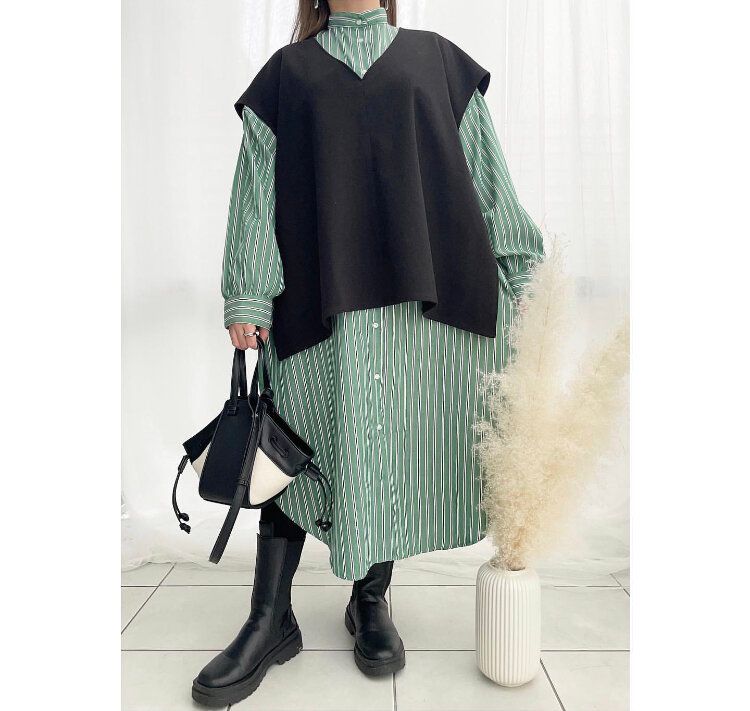 しまむらのストライプシャツワンピースはスタンドカラーデザインの襟なので、シャツコーディネートが苦手な人でも取り入れやすくおススメです。