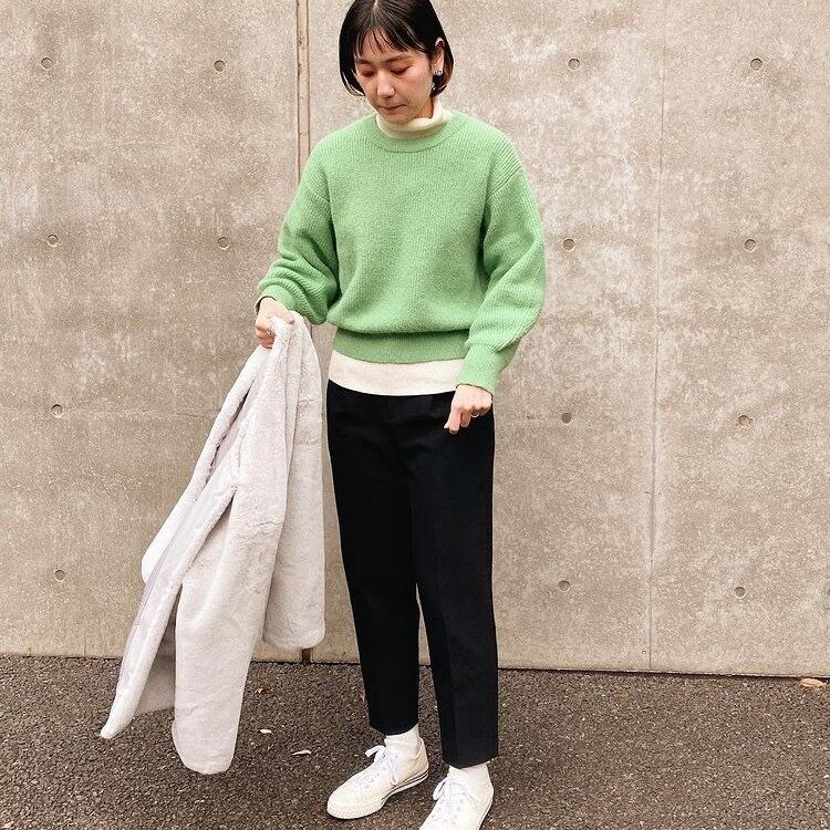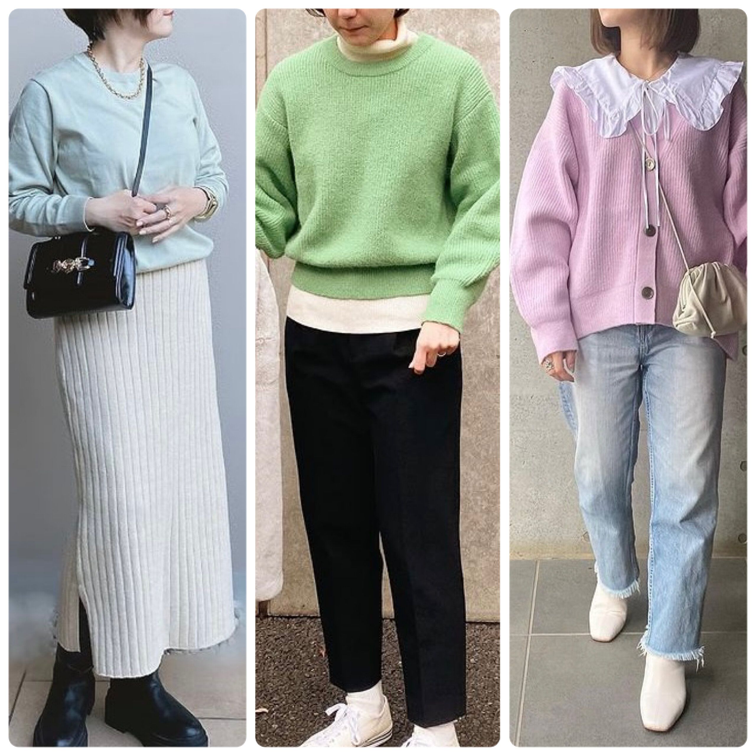 視線が集まるGUの「ヘアリーカラーセーター/1,490円」は、手持ちのベーシックなボトムに合わせるだけで、たちまちフレッシュな気分に!ふわふわとした起毛感も季節感があり、シンプルながらもこなれて見えます。